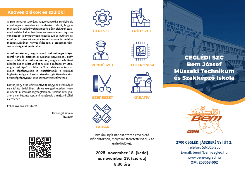 A Ceglédi Szakképzési Centrum Bem József Műszaki Technikum és Szakképző Iskola immáron több mint egy évszázada a város és a térség meghatározó intézménye, mely a korához méltó nagy hagyományokkal rendelkezik a szakmai képzés terén. Intézményünk jogelődjét 1884-ben alapította Czegléd Városa és tanonciskolaként működtette. Az elmúlt immáron több, mint 130 év alatt többször változott a neve, a képzési struktúrája, azonban a célja ma is ugyanaz: a kor kihívásainak, a munkaerőpiacnak megfelelő szakemberek képzése.